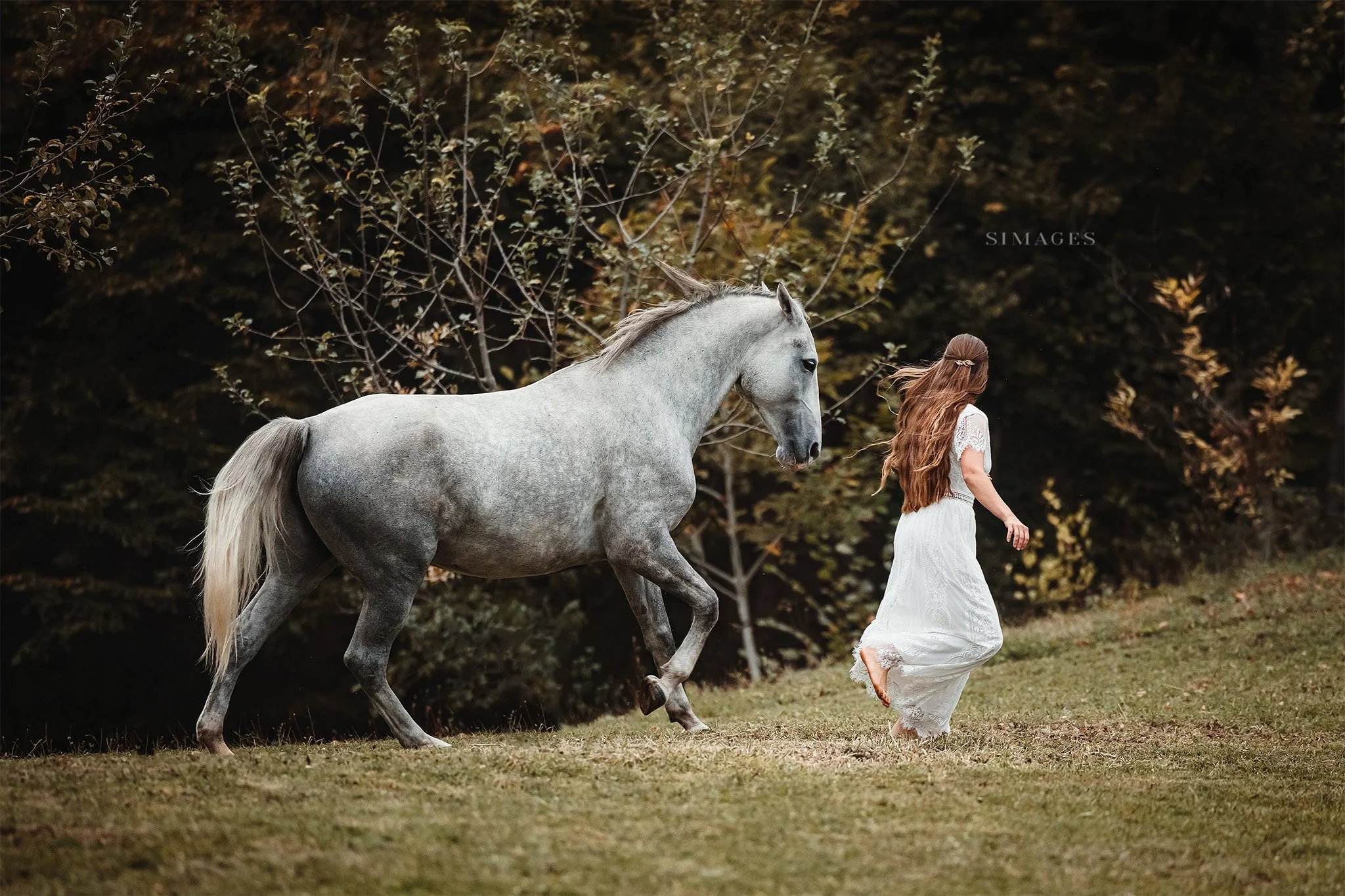 Eine junge Frau in einem langen blauen Kleid geht barfuß mit einem weißen Pferd in einem Wald bei Sonnenuntergang.